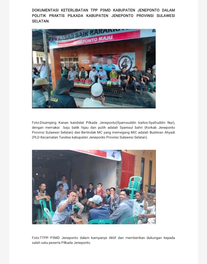 Indikasi Pelanggaran Kode Etik yang dilakukan beberapa TPP P3MD Kabupaten Jeneponto Provinsi Sulawesi selatan terjadi pada hari Rabu tanggal 20 November 2024 berlokasi di Desa Bontomatene Kecamatan Turatea Kabupaten Jeneponto Provinsi Sulawesi Selatan, hal mana TPP P3MD Jeneponto menjadi peserta dan terlibat aktif , sebagai fasilitator dalam pelaksanaan kampanye dialogis (Kampanye Politik), oleh salah satu peserta PILKADA JENEPONTO Tahun 2024 dari peserta Pilkada Nomor urut 4 Syamsuddin Karlos Syafruddin Nur yang di usung oleh Partai Gerindra dan Partai PAN.