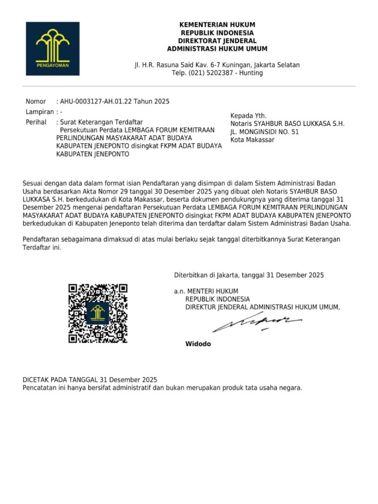 Dengan terbitnya SK tersebut, FKPM Adat Budaya Kabupaten Jeneponto kini memiliki dasar hukum yang sah dan kuat dalam menjalankan peran, fungsi, serta aktivitas organisasinya di tengah masyarakat.